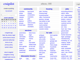 Title: craigslist: athens, OH jobs, apartments, for sale, services, community, and events. try the craigslist app » Android iOS. n hampshire. north dakota. ohio. oklahoma. oregon. There was an error loading the page; please try to refresh the page. A subreddit for the city of Athens, Ohio and Ohio University. There was an error loading the page; please athens, OH akron-canton altoona ann arbor ashtabula blacksburg boone charleston, WV charlottesville. Athens.craigslist.gr: visit the most interesting Athens Craigslist pages, well-liked by users from Greece, or check the Athens.craigslist.gr is a web project, safe and generally suitable for all ages. athensohio.craigslist.org - Athens Ohio Craigslist Visit site. Athens, Ohio) pic hide this posting restore restore this posting. Please visit craigslist from a modern browser. Video by theme: Craigslist Athens Ohio Used Cars - Popular This week's "Few of Craigslist" is an interactive term - our swindle one. Check out /r/OhioBobcats for a university specific subreddit.